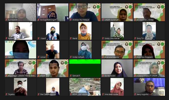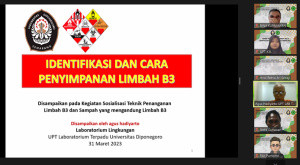 Kegiatan ini dilakukan secara online via zoom meeting diikuti oleh seluruh tenaga laboratorium yang ada di Universitas Diponegoro. Dengan adanya sosialisasi ini, harapannya para tenaga laboratorium dapat mengetahui cara identifikasi, penyimpanan, pemberian kode sesuai jenis, dan pengemasan yang aman sebelum disalurkan ke pihak ketiga untuk dilakukan pengelolaan lebih lanjut.
