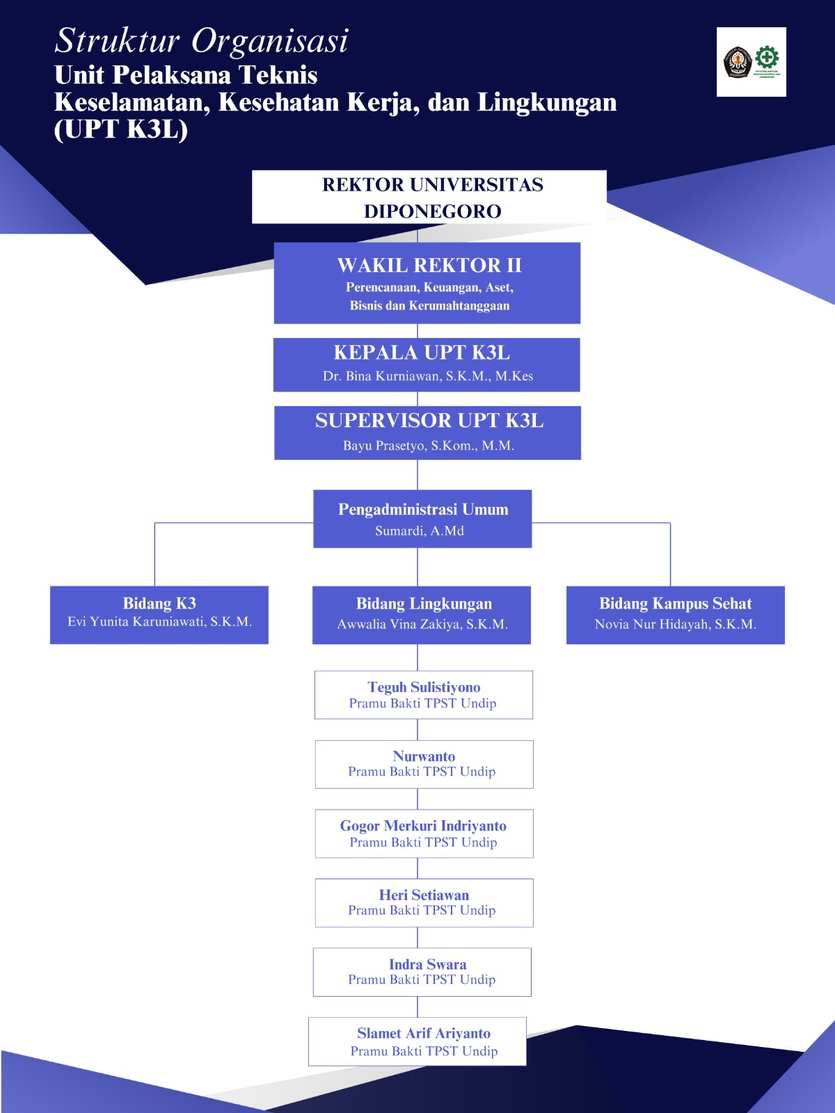 The Technical Implementation Unit for Occupational Safety, Health, and Environment (UPT K3L) at Diponegoro University is part of the university’s commitment to creating a safe, healthy, and sustainable campus. Based on Rector’s Regulation Number 6 of 2021 concerning the Organizational Work Procedures of Elements Under the Rector of Diponegoro University, the UPT K3L was established as a non-academic support unit that assists the duties and functions of the Vice Rector for Human Resources in the areas of occupational safety, health, and the environment.